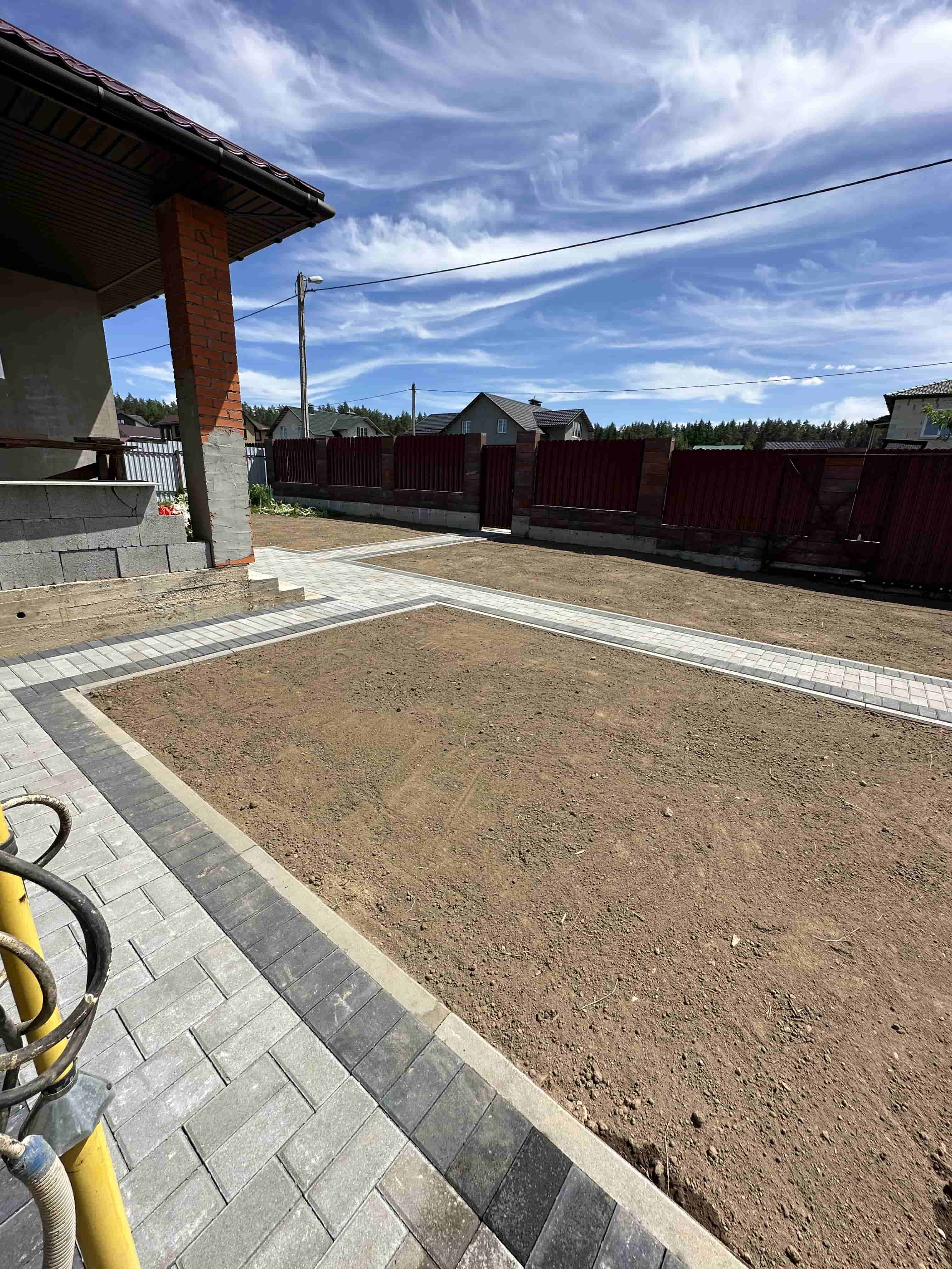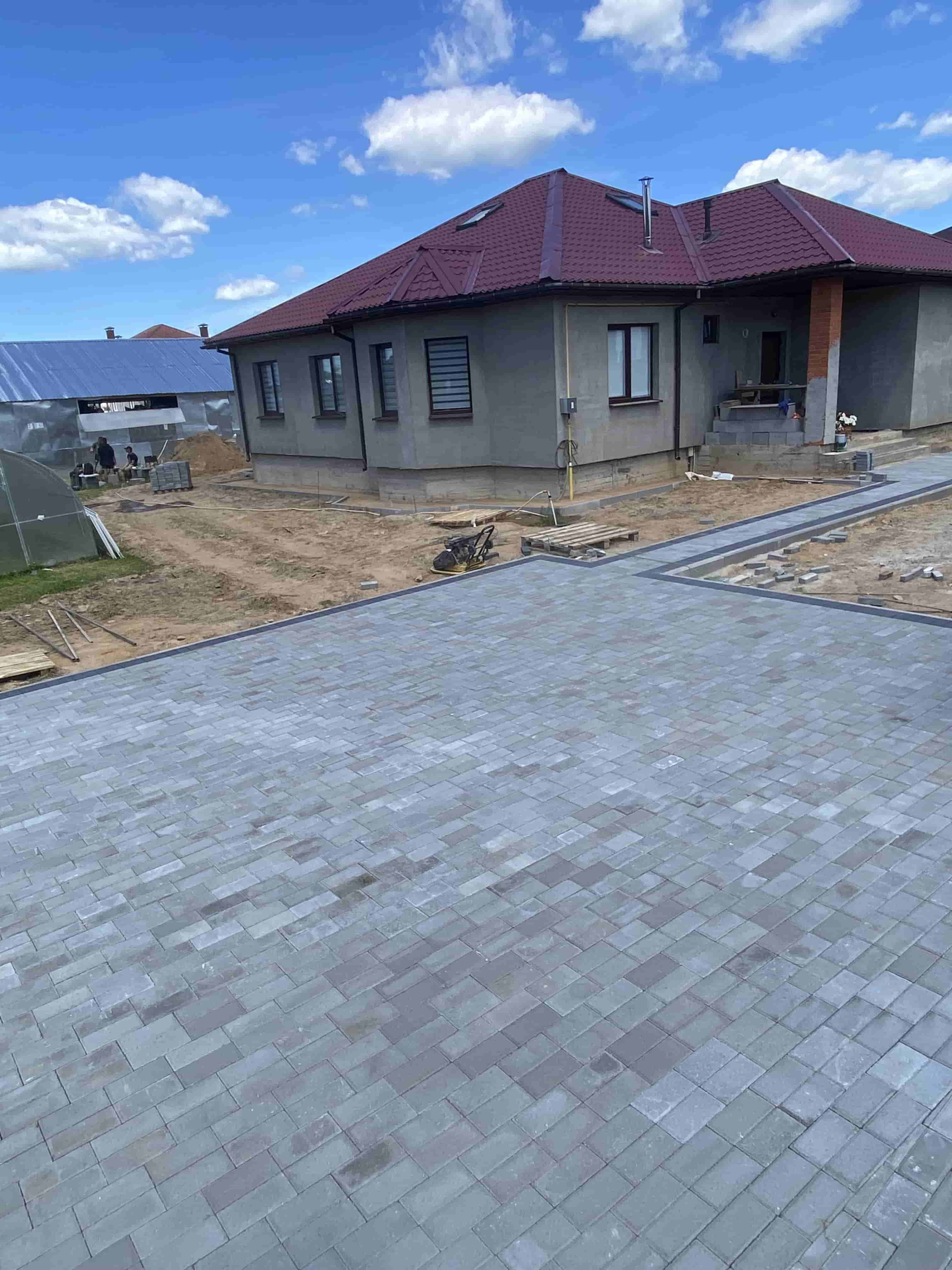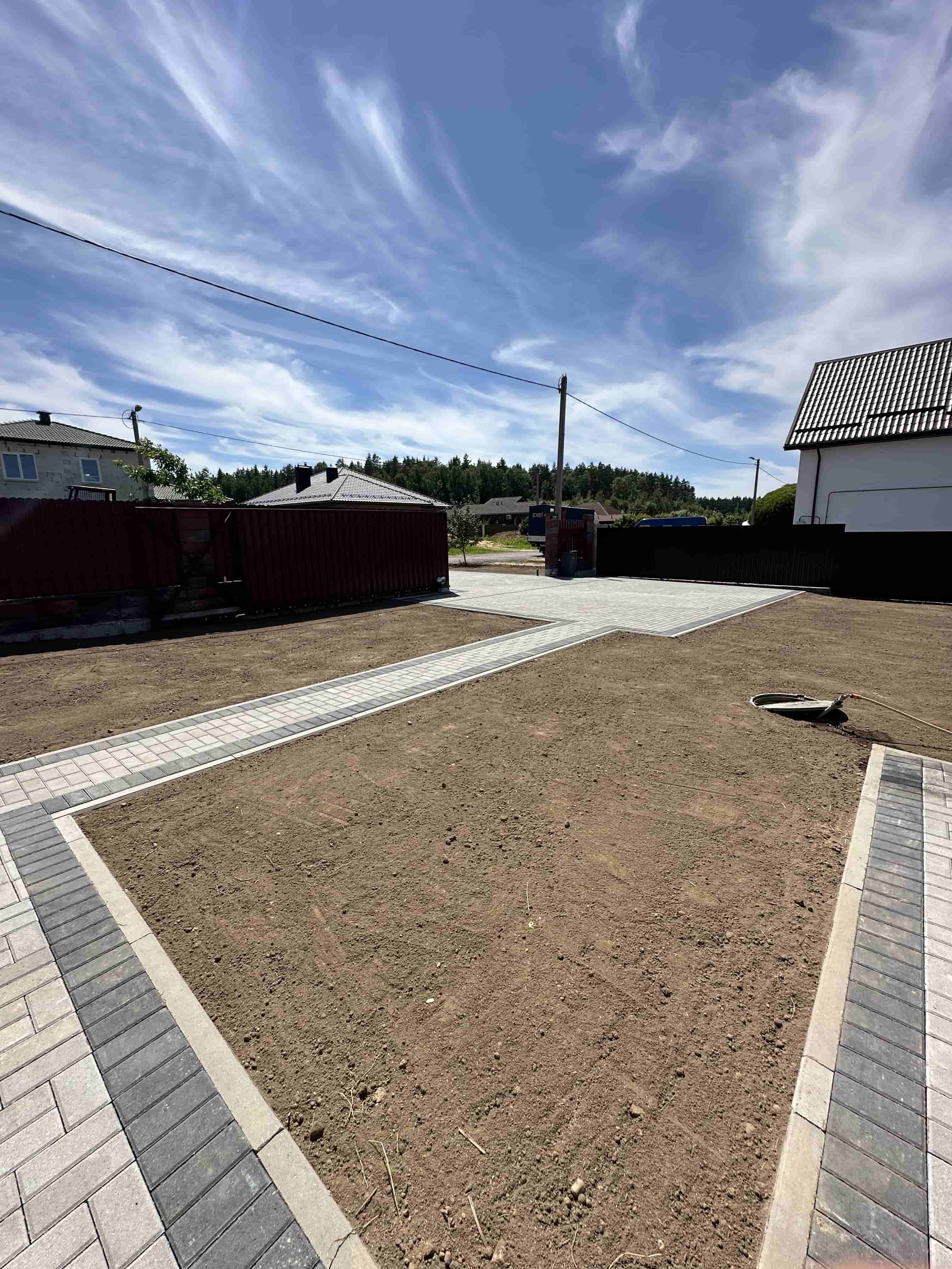 Следующим шагом стала укладка тротуарной плитки как на въезде от дороги, так и на дворовой территории. Для повышения прочности и устойчивости плитки мы усилили основание, что позволит избежать деформаций и повреждений в будущем. Вокруг дома были также созданы удобные дорожки из тротуарной плитки, которые гармонично вписываются в общий ландшафт.