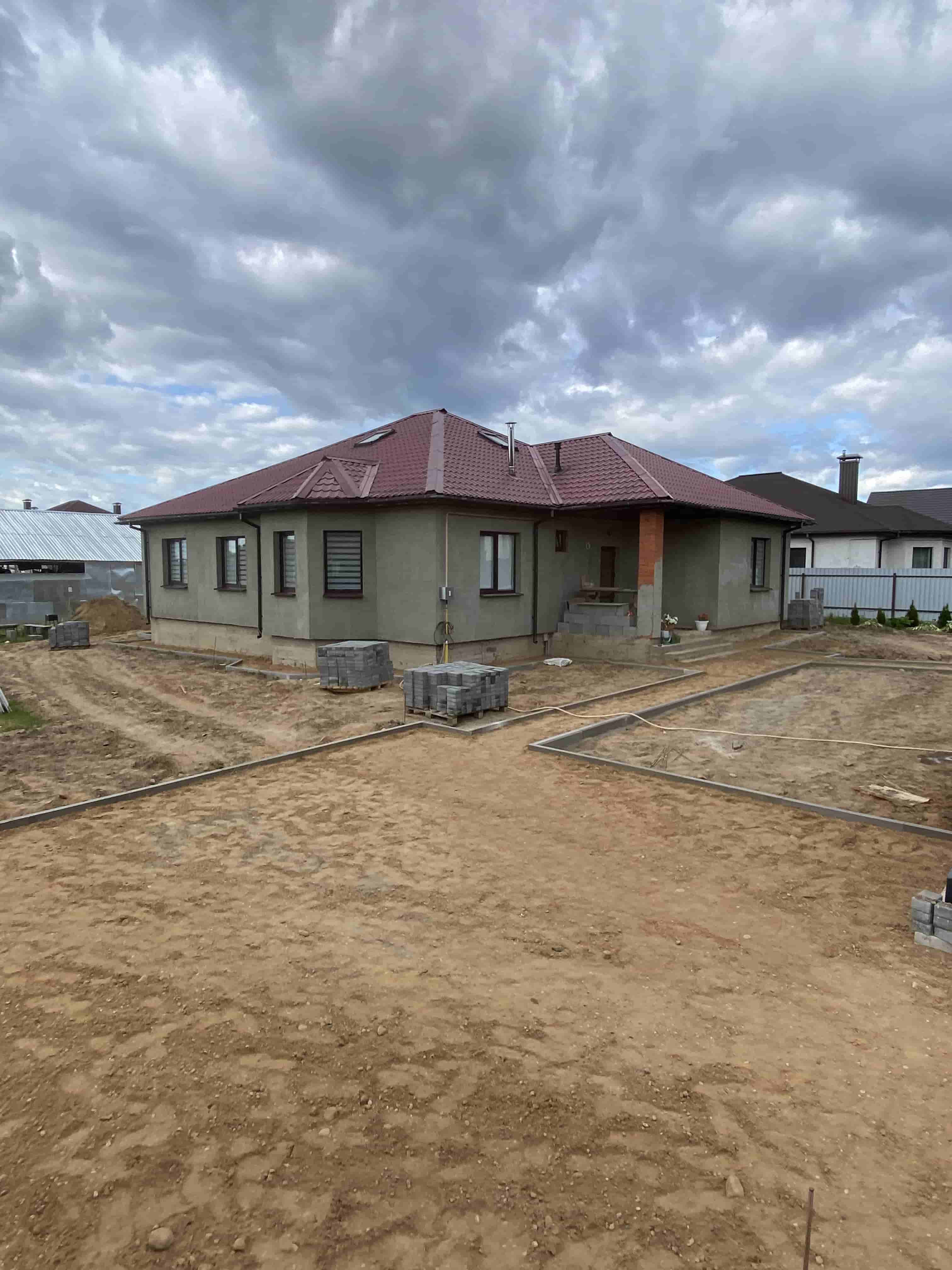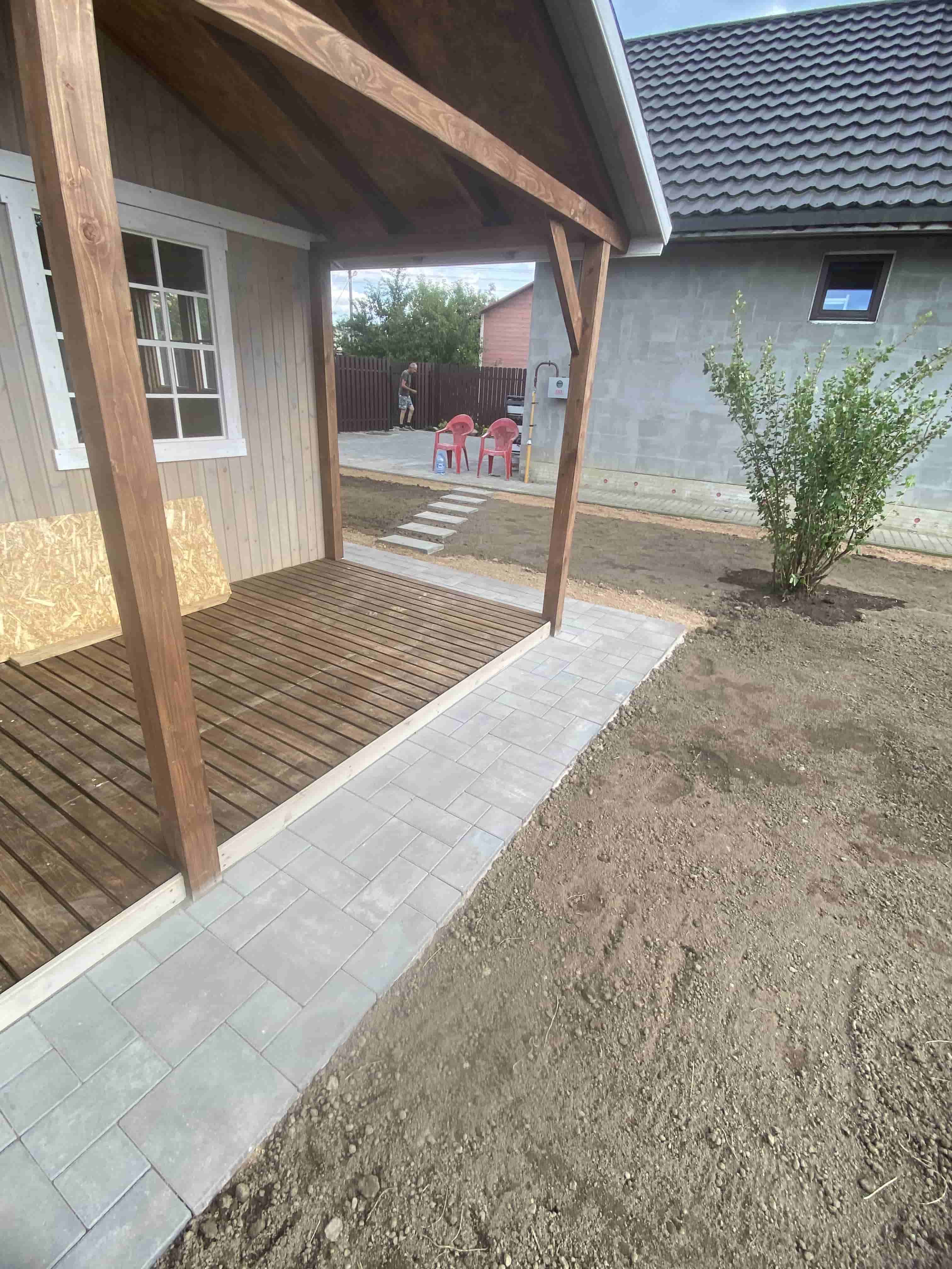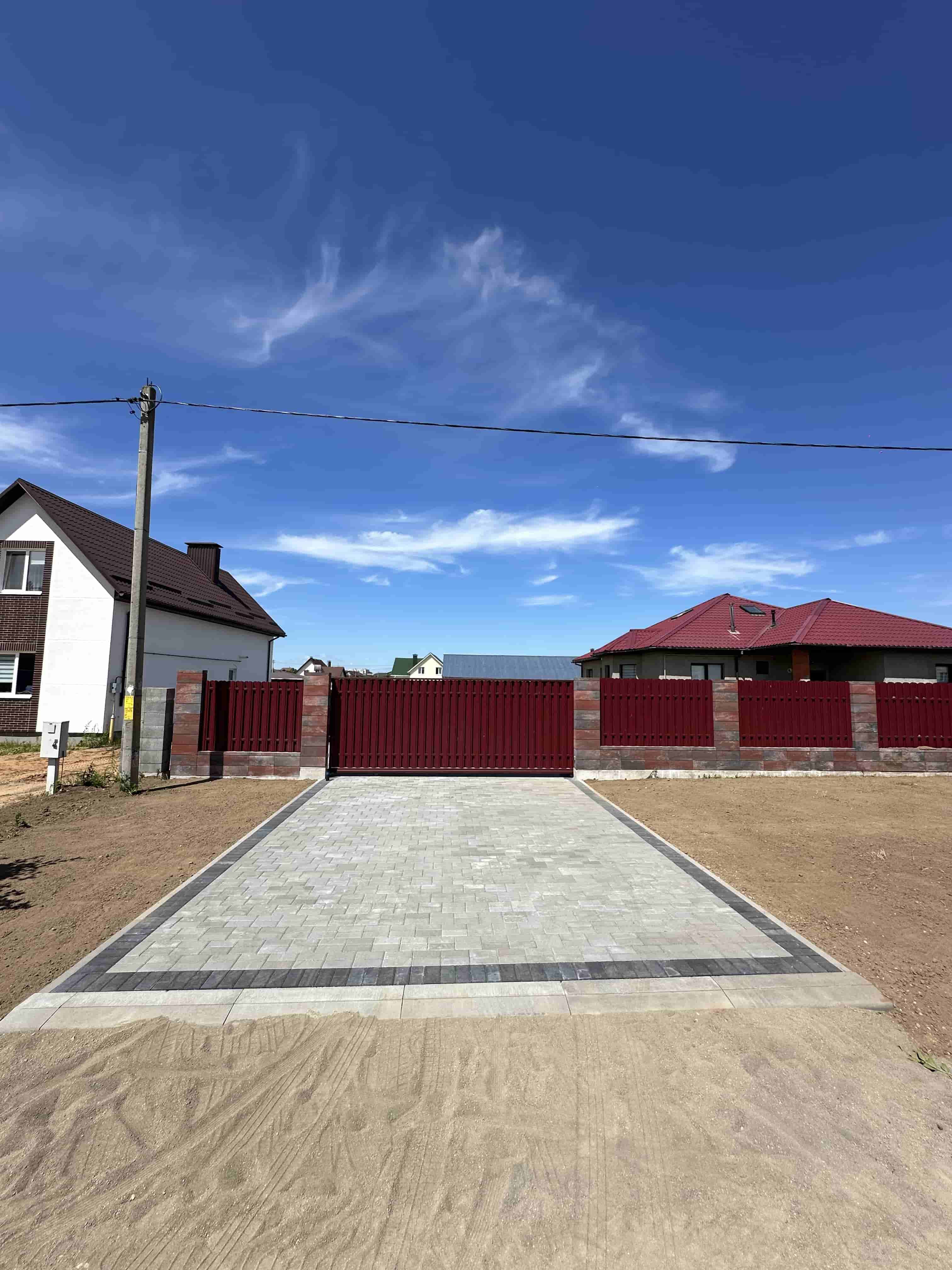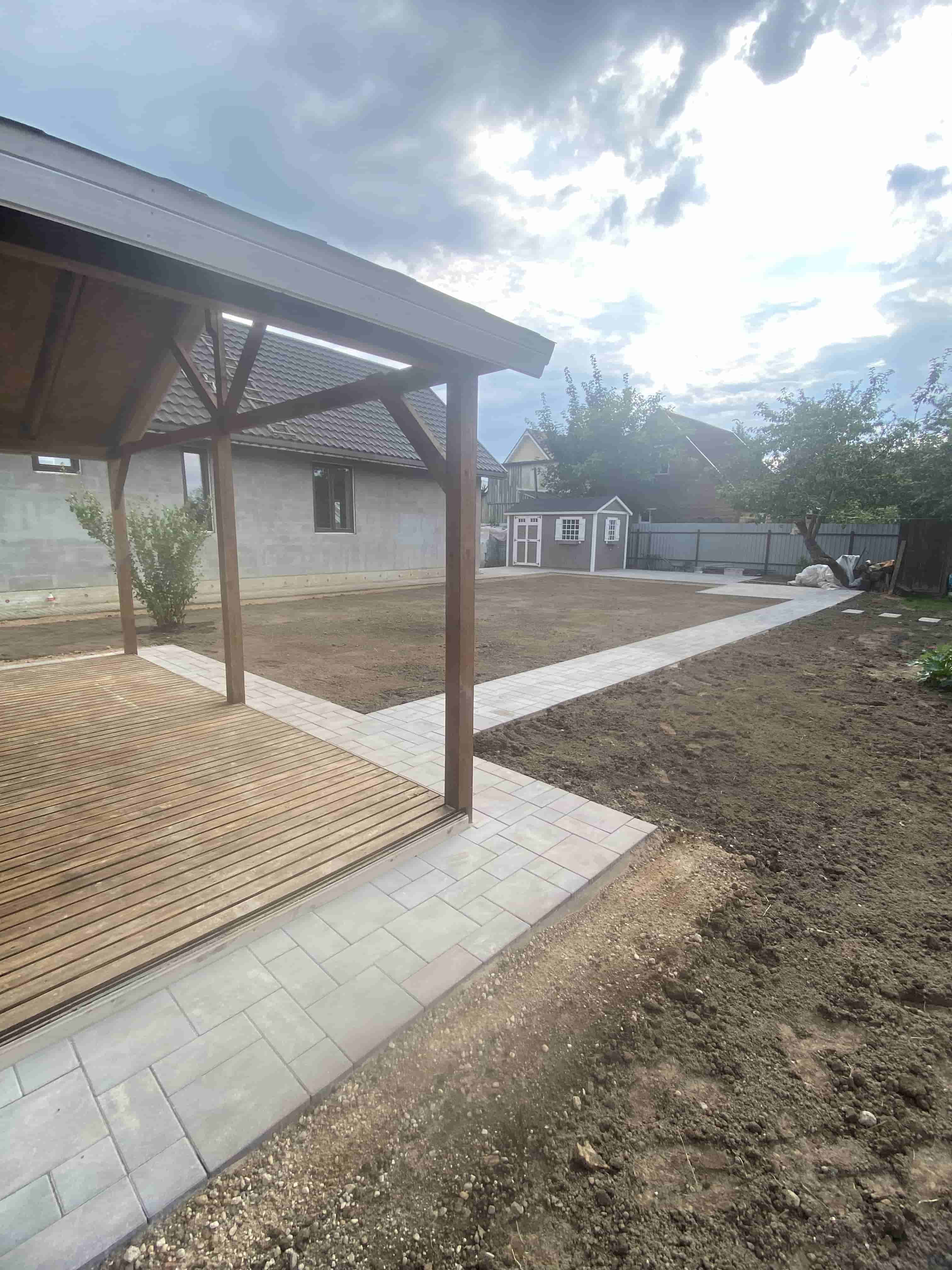 Следующим шагом стала укладка тротуарной плитки как на въезде от дороги, так и на дворовой территории. Для повышения прочности и устойчивости плитки мы усилили основание, что позволит избежать деформаций и повреждений в будущем. Вокруг дома были также созданы удобные дорожки из тротуарной плитки, которые гармонично вписываются в общий ландшафт.